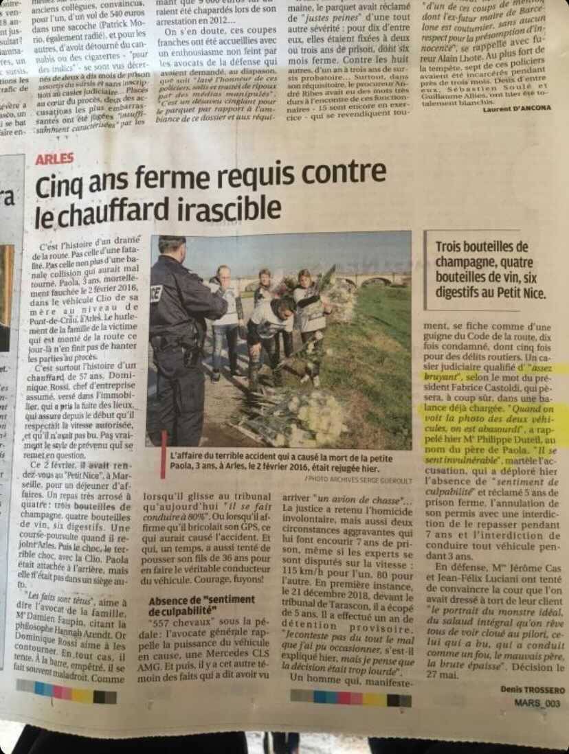 Ce 2 février, il avait rendez-vous au "Petit Nice", à Marseille, pour un déjeuner d'affaires. Un repas très arrosé à quatre : trois bouteilles de champagne, quatre bouteilles de vin, six digestifs. Une course-poursuite quand il rejoint Arles. Puis le choc, le terrible choc, avec la Clio. Paola était attachée à l'arrière, mais elle n'était pas dans un siège auto.